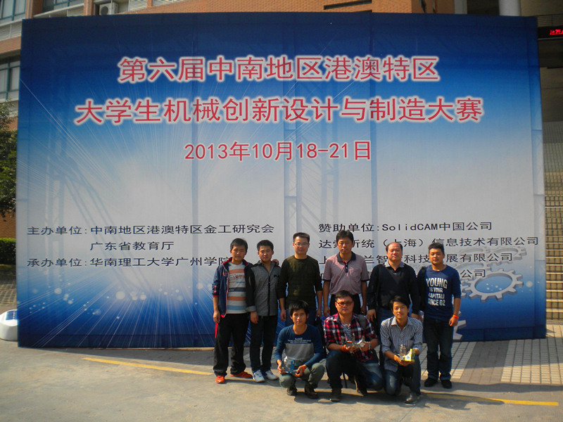 第六届中南地区港澳特区大学生机械创新设计与制造大赛于2013年10月18日至21日在广东省广州市成功举行。面对来自澳门大学、华中科技大学、华南理工大学、湖南大学等四十二所高校和强手,beat365官网机械专业学生刘赞和易宽寒等同学组成的团队,通过现场演示、快速成型、风险答辩、数控加工等环节的比拼,荣获了二等奖的好成绩。本次比赛由工程训练中心主任王湘江老师带队,指导老师有欧阳八生、杨毅老师。