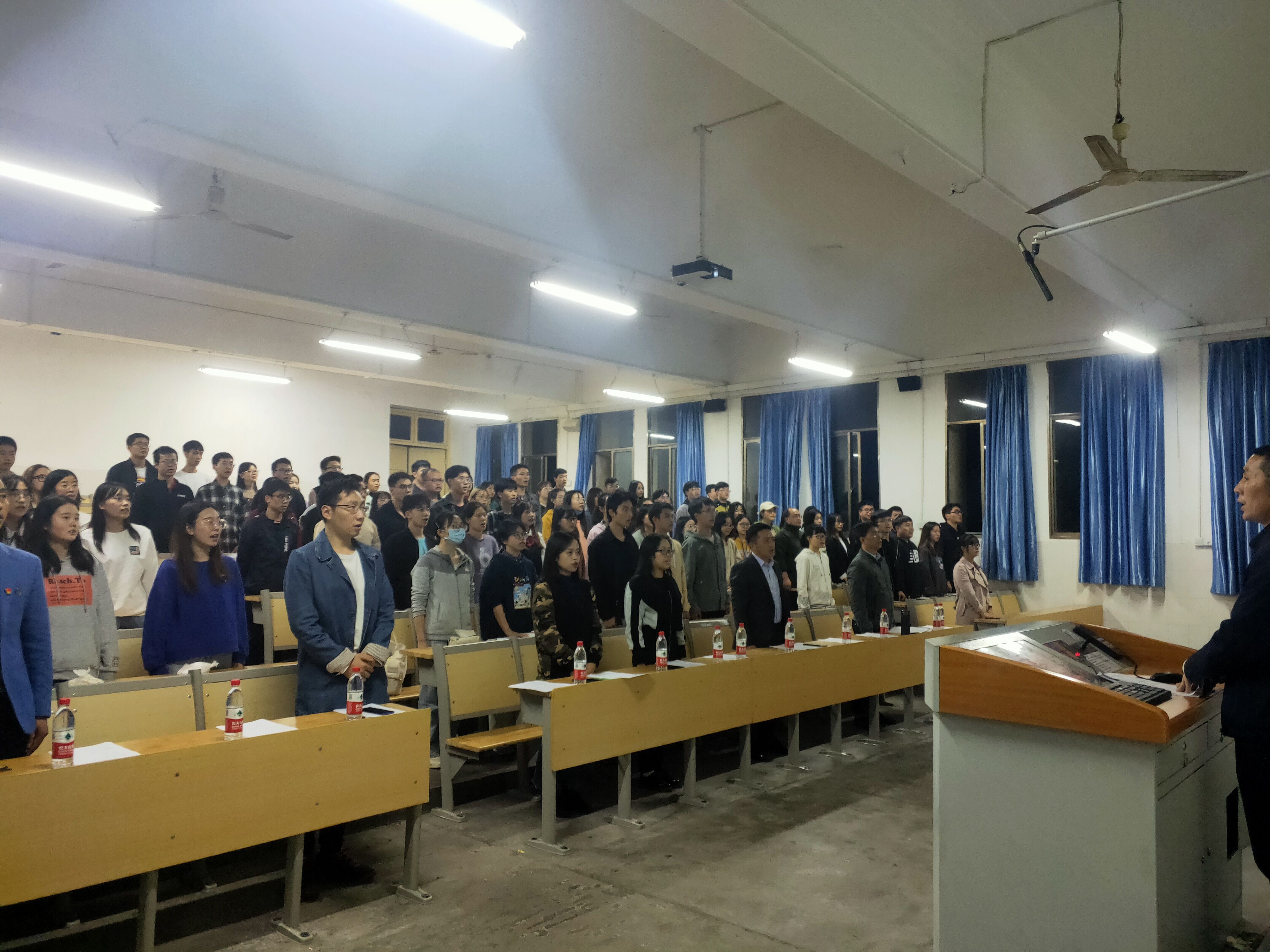 随着庄严的国歌旋律在教室中响起,全体师生共同唱起《中华人民共和国国歌》,旷勇副书记宣读参加入党宣誓的新党员名单,在院学工室主任、文科第一学生党支部书记周英老师领誓下,92名新发展的预备党员面对鲜艳的党旗进行了入党宣誓,立下自己对党忠诚的誓言,表达了为党的事业奋斗终身的决心和愿望。
