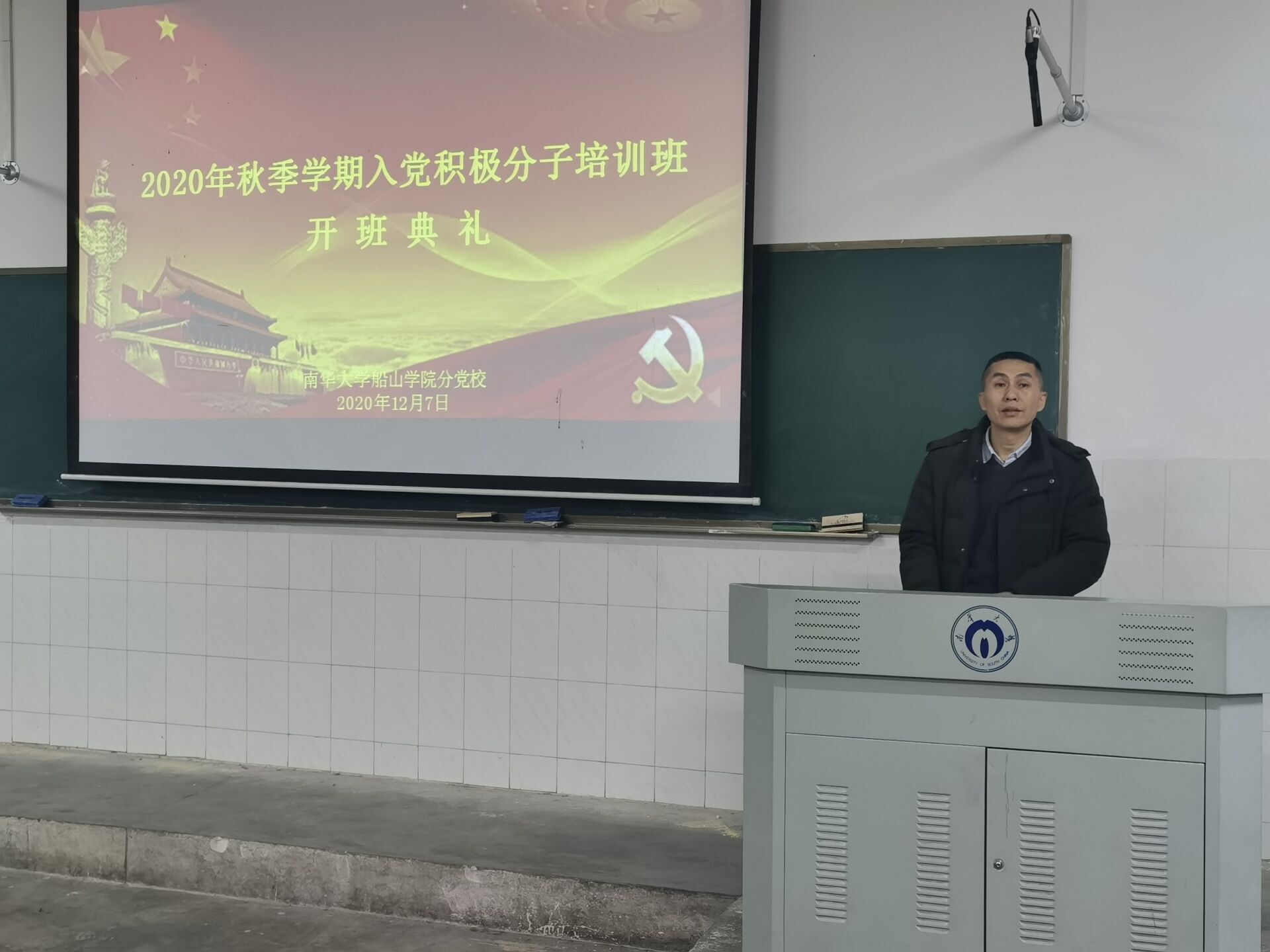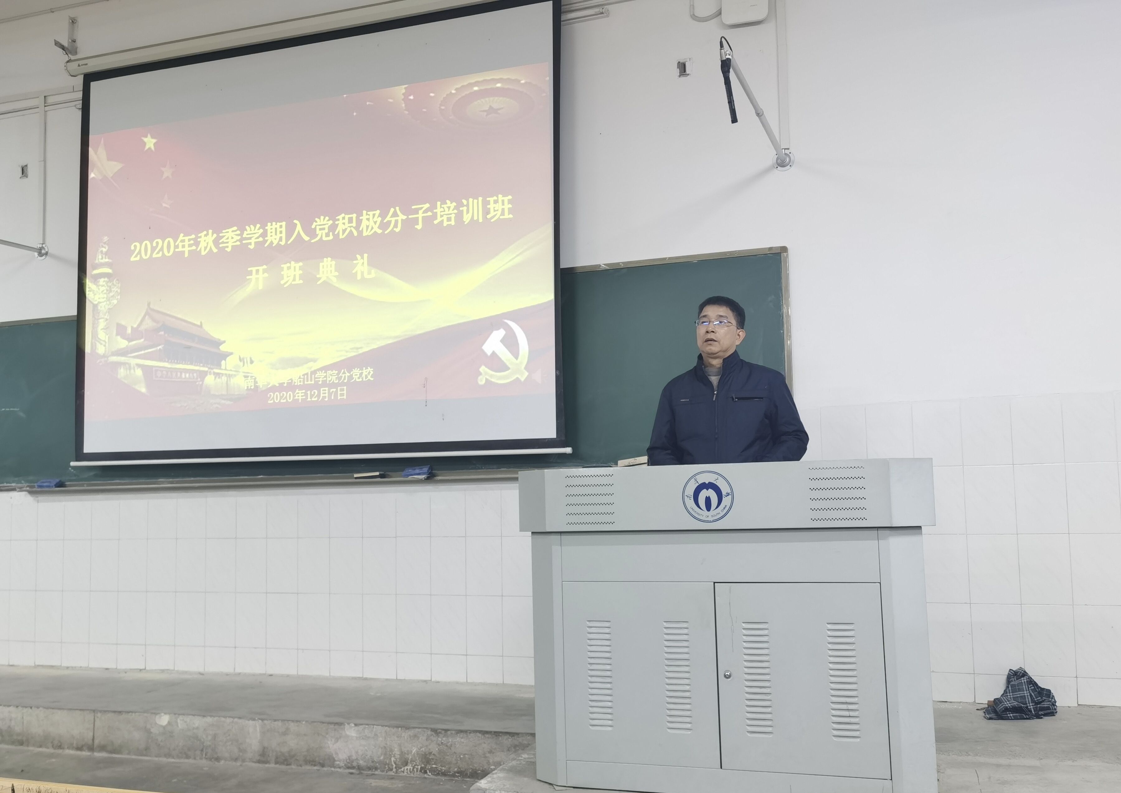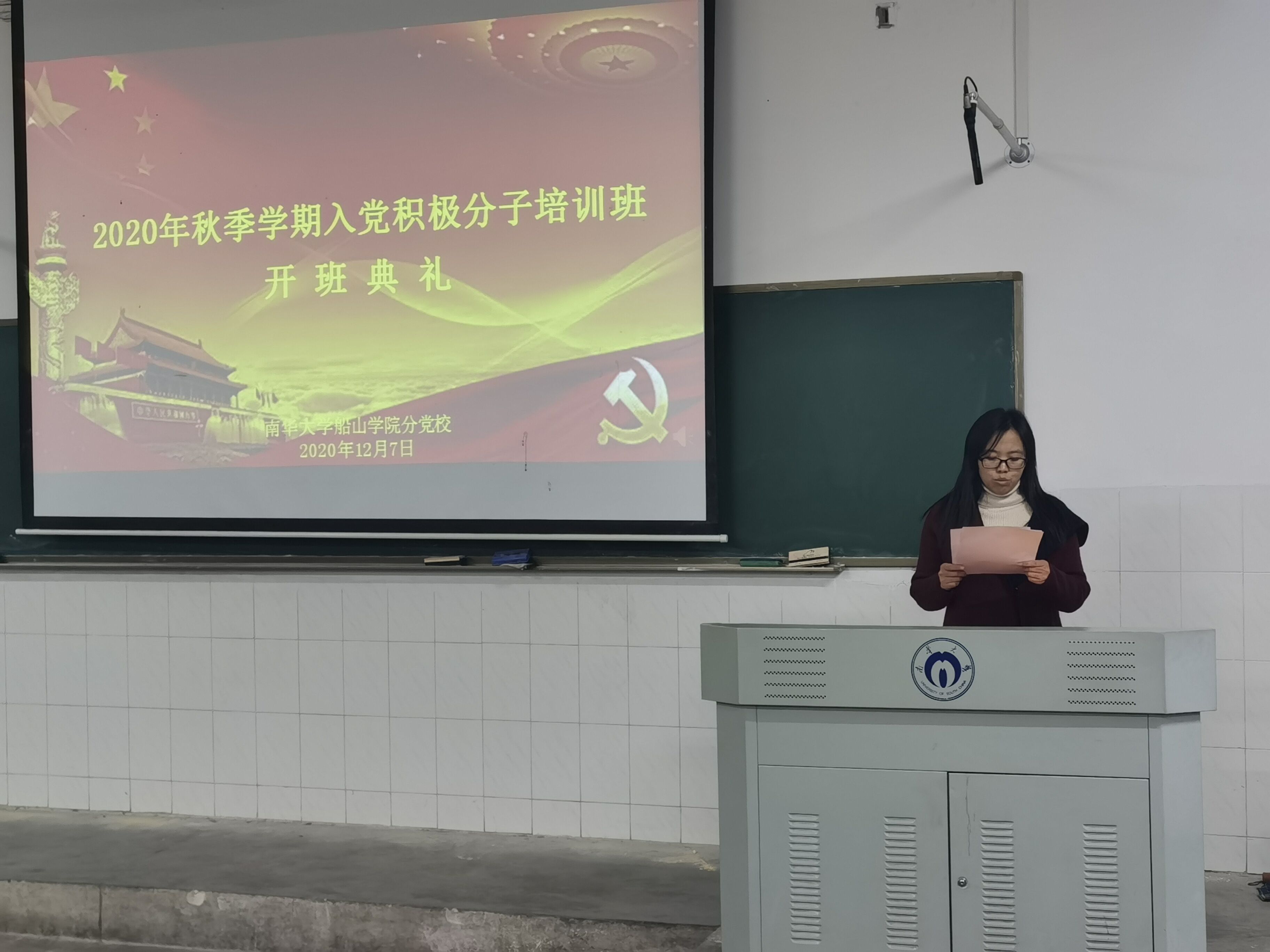 开班仪式在全体师生齐唱高亢激昂的《中华人民共和国国歌》 中拉开了帷幕。首先由周英老师宣读本次学习培训的有关制度和编班情况。接着,阳剑兰书记作动员讲话,他对各位学员表示热烈的祝贺,介绍了培训班的意义、目的和入党的流程,指出入党积极分子参加集中培训是加入党组织的必要条件。要求学员们进一步端正入党动机、树立正确的学习态度,合理处理好党培课与专业学习、业余生活时间上的冲突。珍惜培训机会,严格按照培训的要求完成各项学习任务,争取早日加入党组织。