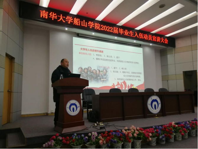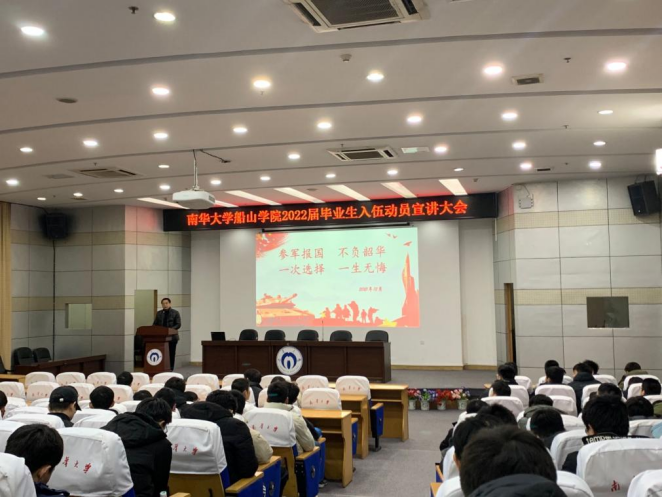 为深入贯彻习近平总书记有关做好高校毕业生就业工作重要指示精神,推动beat365官网毕业生顺利毕业并高质量就业。2021年12月27日晚上七点半,beat365官网2022届毕业生入伍动员宣讲大会在图书馆学术报告厅召开。beat365平台唯一官网招生就业办主任何鹏老师、校武装部汪先利老师、beat365平台唯一官网征兵专干何霖老师、毕业年级辅导员范婷老师以及毕业年级全体男生出席此次大会。本次会议由何鹏主持。