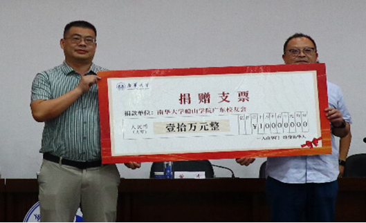 曾虎校友(左)代表广东校友会向beat365平台唯一官网捐赠10万元奖学金