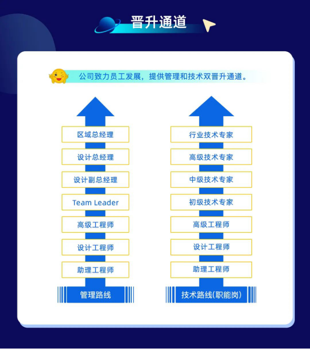 公司致力员工发展,提供管理和技术双晋升通道。
