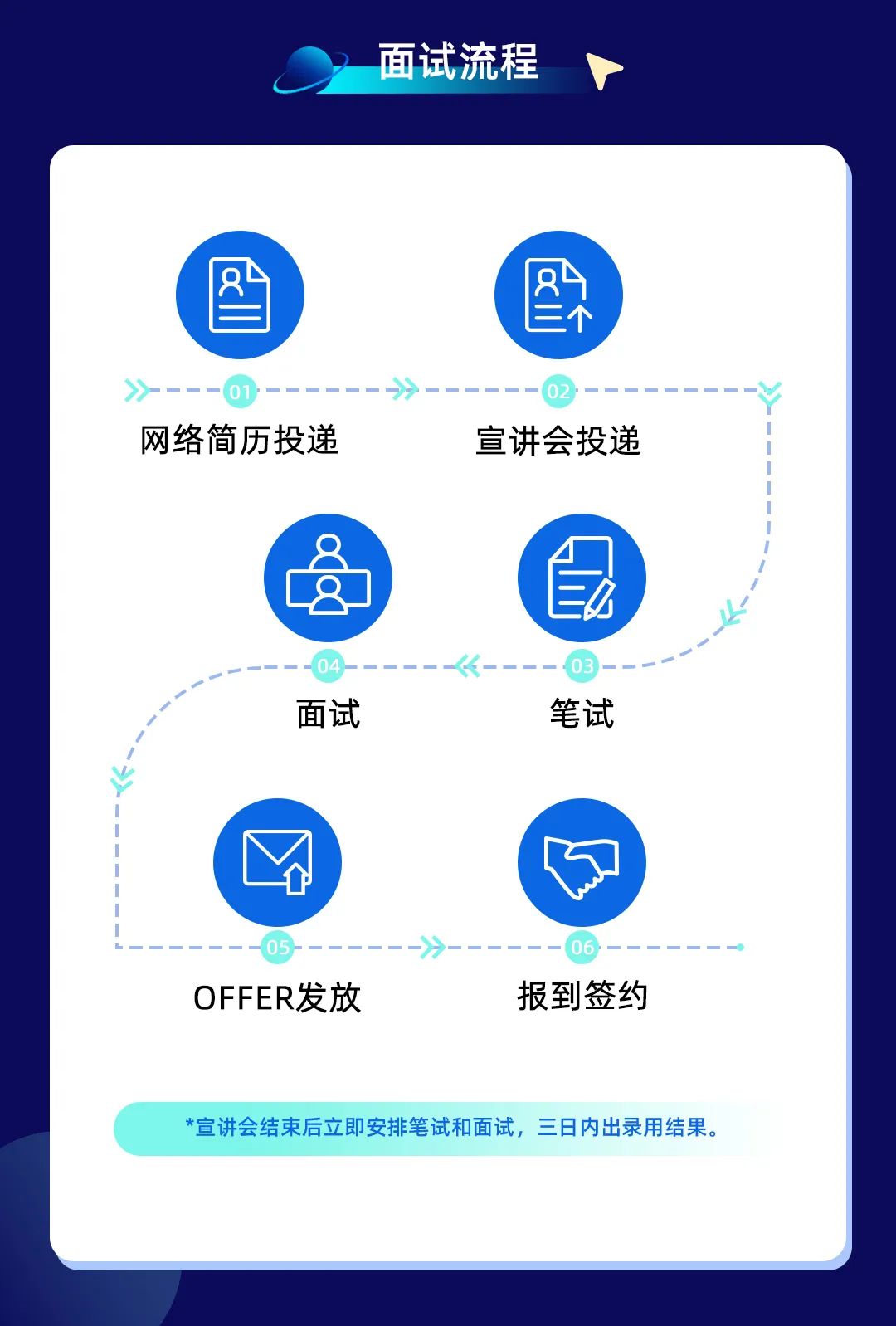 *宣讲会结束后立即安排笔试和面试,三日内出录用结果。