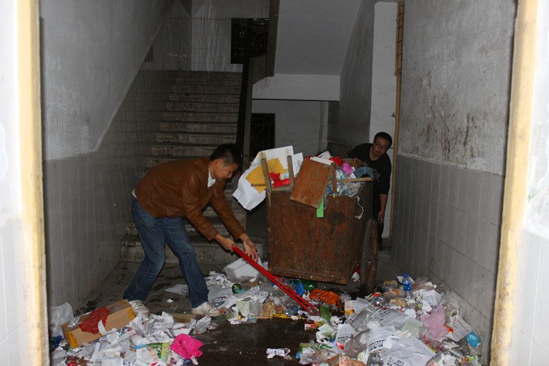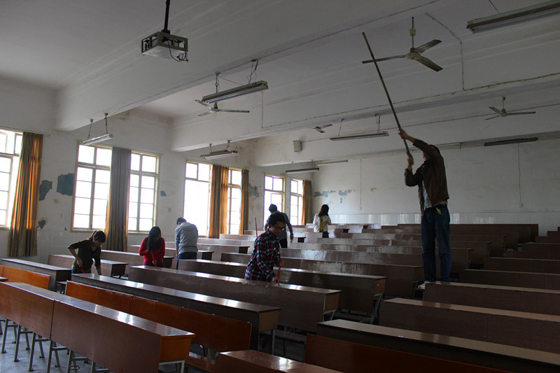 本应在星期天休息的广大院团学干部早早的就带着劳动工具在二教201教室集合,在院勤工助学中心同学做细致的指导和讲解后,让同学们明确了各自劳动区域的清洁要点。紧接着,举行了一个小型的动员仪式,片刻间大家的干劲更加充足了。随后,大家纷纷拿起劳动工具开始了对二教各个卫生区域开展认真细致的清理。清理过程中同学们分工明确、积极有序不放过任何一个角落,大到地面的杂物、课桌里的碎纸屑,小到插座上的灰尘,黑板刷上的粉笔灰,都一一认真地打扫干净。不知不觉中天渐渐黑了,大家依然干劲十足,小心翼翼地擦拭展板,一丝不苟地刷洗地板,集中地往外运送清理出来的垃圾。直到晚上8点多才满意的悄悄离开教学楼。
