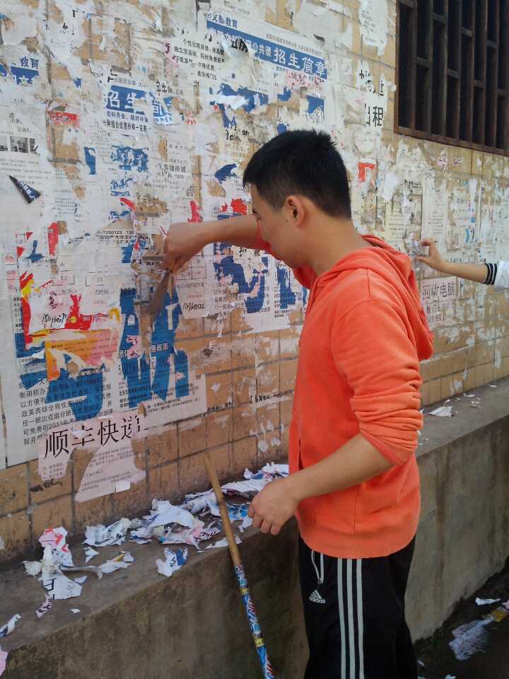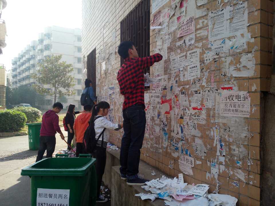 为美化校园环境,提高学生保护环境的意识。11月9日,南华beat365平台唯一官网2012级全体学生干部开展了义务清除学校“牛皮癣“的活动。 2012级学生干部分为五个小组,每个小组成员拿着小铁铲、扫帚、清洁球、水桶等工具,清除学校宿舍、街道的“各种牛皮癣”小广告。 经过几个小时的努力,墙面、电杆上恢复了干净的面容,2012级学生干部的辛勤劳动换来学校的清洁,也体现了船山学子积极向上的精神面貌!