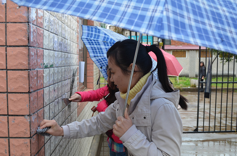 11级全体党员、预备党员学生对学校学生宿舍楼下的墙体进行清洁,去除“牛皮癣”。尽管天气比较冷,蒙蒙细雨的出现也依旧无法减退的同学们高昂的热情。经过同学们半个多小时的辛勤劳动,原本被贴上“牛皮癣”的墙体,已浮现出它原本光鲜的模样。
