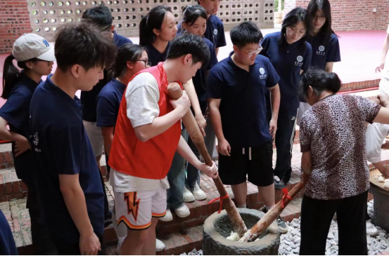 糍粑制作包括选材、浸泡、蒸煮、打糍粑、成型、保存6个步骤,将蒸熟的糯米倒入石臼中,用木制锄或木棍反复捣鼓,使其变得粘性十足并融为一体。这个过程需要多人协力完成,同学们体验后纷纷感慨巧用力气是打好糍粑的关键。同学们将打好的糍粑取出,放在簸箕或案板上,用手或模具将其塑造成所需的形状,然后撒上白糖,糍粑就制作完成。