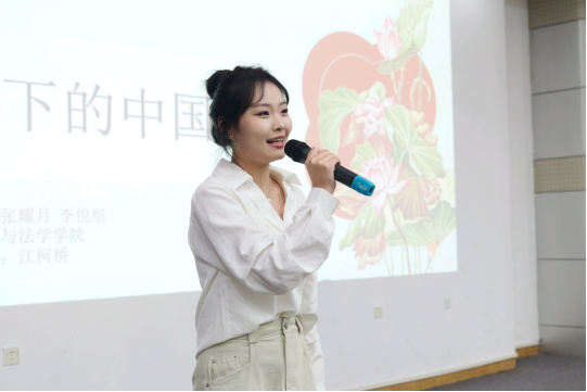 接下来是由药学院与核科学与技术学院带来的《祖国啊,我亲爱的祖国》、《巾帼颂》、《归国》。“平凡中蕴藏伟大巾帼英豪,明媚的春天里,生机盎然,柔情里满是激昂”巾帼英雄不让须眉,她们在不同时代,用自己的力量展示着女性的力量。“我是新刷出的雪白的起跑线,是绯红的黎明正在喷薄,祖国”“我回来了,我回来了,我的祖国”每一句诗词中都彰显着华夏儿女心中荡漾着的对祖国深沉的热爱。