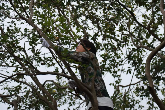 清晨7点,志愿服务队从学校出发,到达星火村茶树林后与村民并肩劳作,一边学习采摘技巧,一边倾听村民讲述茶油籽的种植故事。尽管山路崎岖、劳动强度大,但师生们热情高涨,干劲十足,田间地头洋溢着忙碌的丰收氛围。阳光下,红马甲的身影与翠绿的茶林交相辉映,形成一道亮丽的风景线。