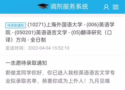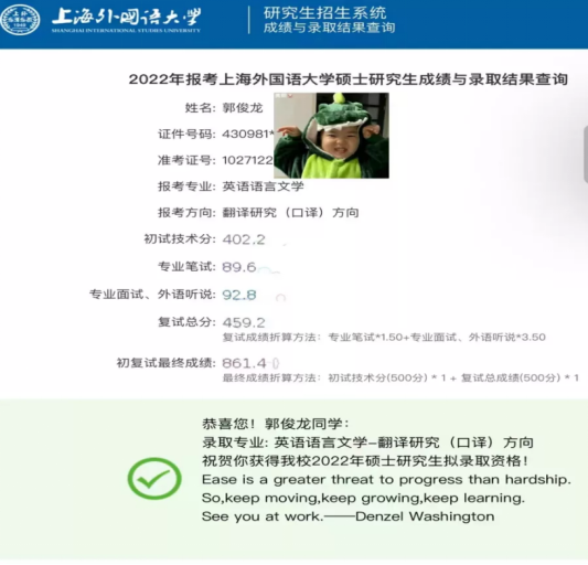 “选择考研目标院校时,我的想法很简单,要去语言学习的殿堂级高校”,上海外国语大学便是他的首选,上外是全国高校唯三语言文学全国学科评估A+,同时全国软科2020年排名第一,2021年排名第二。但他的想法收到的除了鼓励,还有不少的质疑,“上外对你来说难度太大了,你考的方向今年在全国也只招5个,还是换一个更有把握的学校吧”。郭俊龙却不这么想,他认为他have nothing to lose,如果今年考不上,那就“二战”继续考!秉持着这种态度,他敢想敢做敢冲,最终闯入了考研决赛圈,成功获得上外的邀请函。