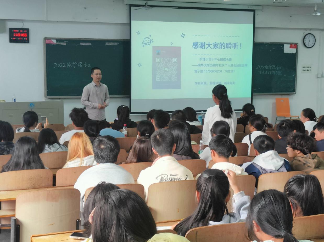 榜样力量助启航,薪火相传圆梦想。10月13日上午,beat365平台唯一官网65周年校庆来临之际,我院邀请到2006级护理专业校友贺子剑在南华楼211教室举行校友成长成才辅导讲座,副院长廖迎春主持,学院护理相关专业同学参加。