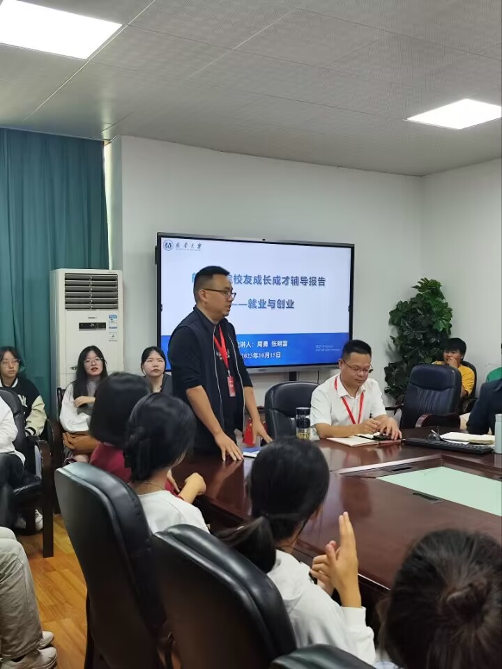 2023年10月15日上午,周勇、张明富两位校友在学院会议室作了题为《就业与创业》的成长成才辅导讲座,院党委书记书记阳剑兰主持,国贸相关专业同学参与。