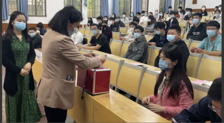 在计票期间,学院党委副书记刘期彪对全体学生党员开展了党性教育,强调党员要充分发挥党员的模范带头作用,特别是毕业生党员要站好最后一班岗,在当前的新冠疫情防控、学生稳定和就业等工作中示范带头,为学校和学院发展贡献出自己应有的力量。